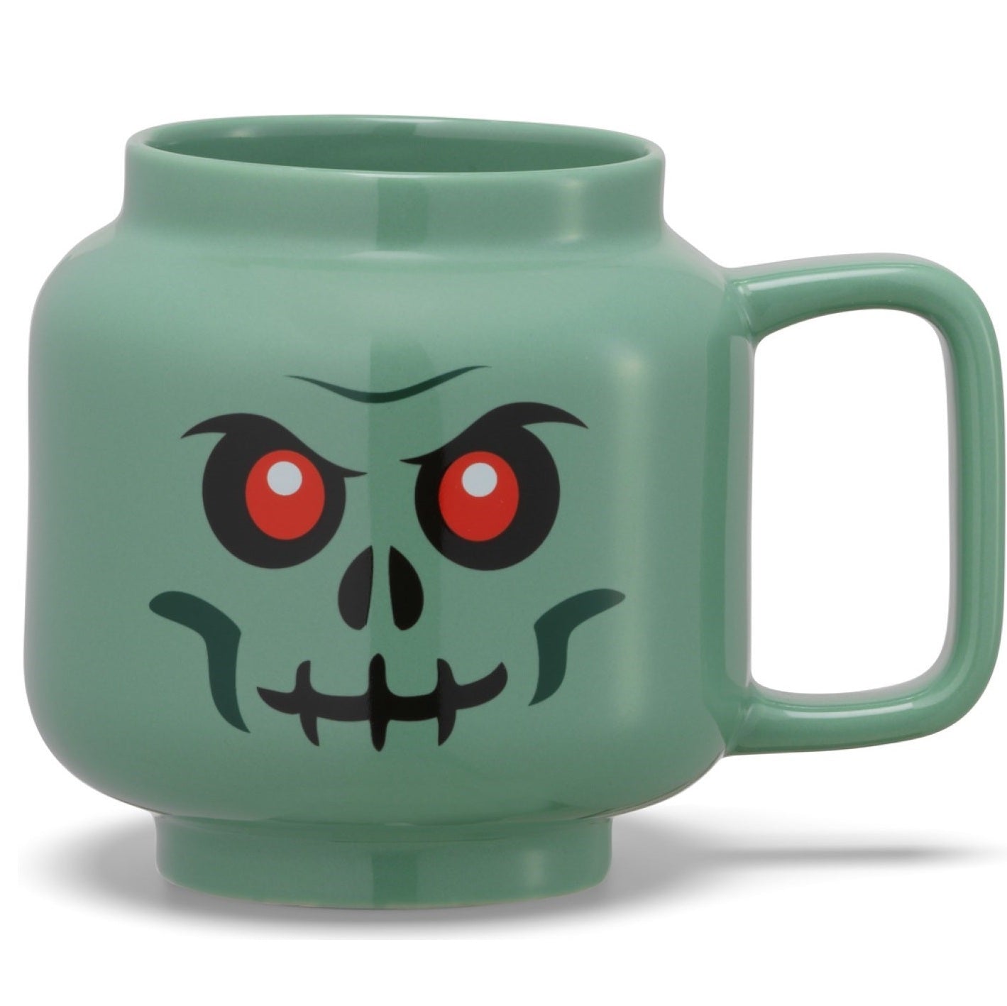 - Stort minifigurkrus med hodeskalle – den olivengrønne keramikkoppen er formet og dekorert som en overdimensjonert LEGO® minifigurhodeskalle