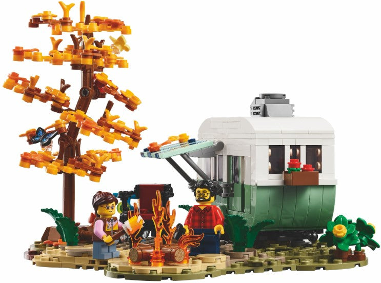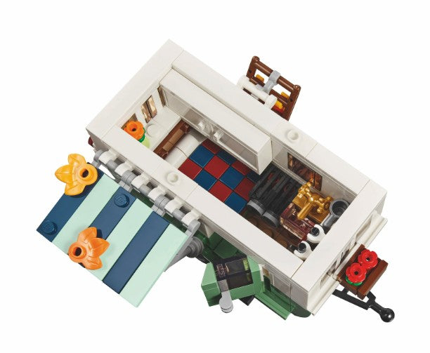 Det tofargede eksteriøret til campingvognen i vintagestil har en fungerende dør, festet markise, klimaanlegg, vaskestativ og kran. Innvendig er det campy-koselig, med alle de vanlige fasilitetene du forventer - inkludert et kjøkken med komfyr, vask og kjøkkenutstyr; en seng i minifigurstørrelse, og til og med ekstra lagringsplass!