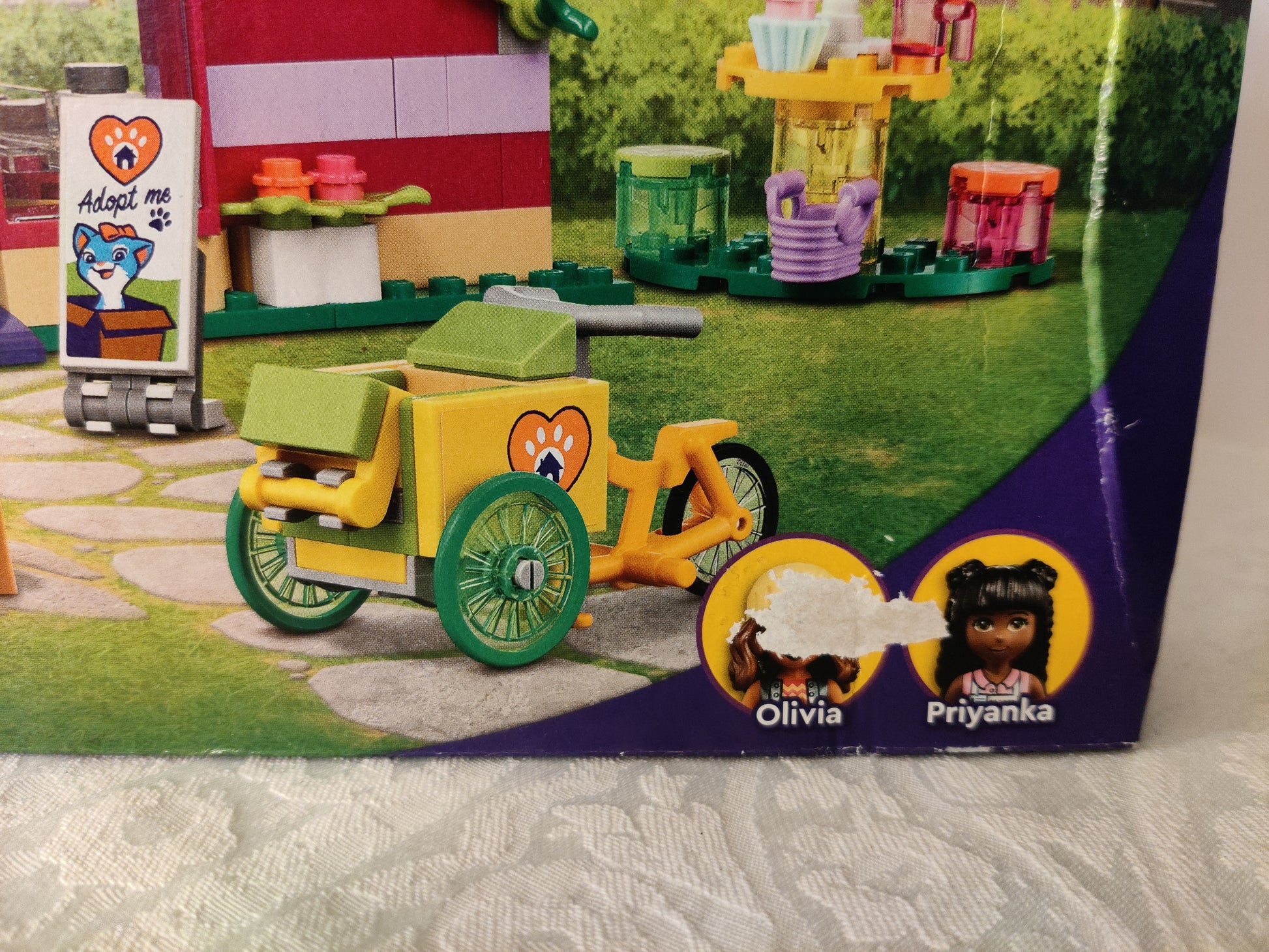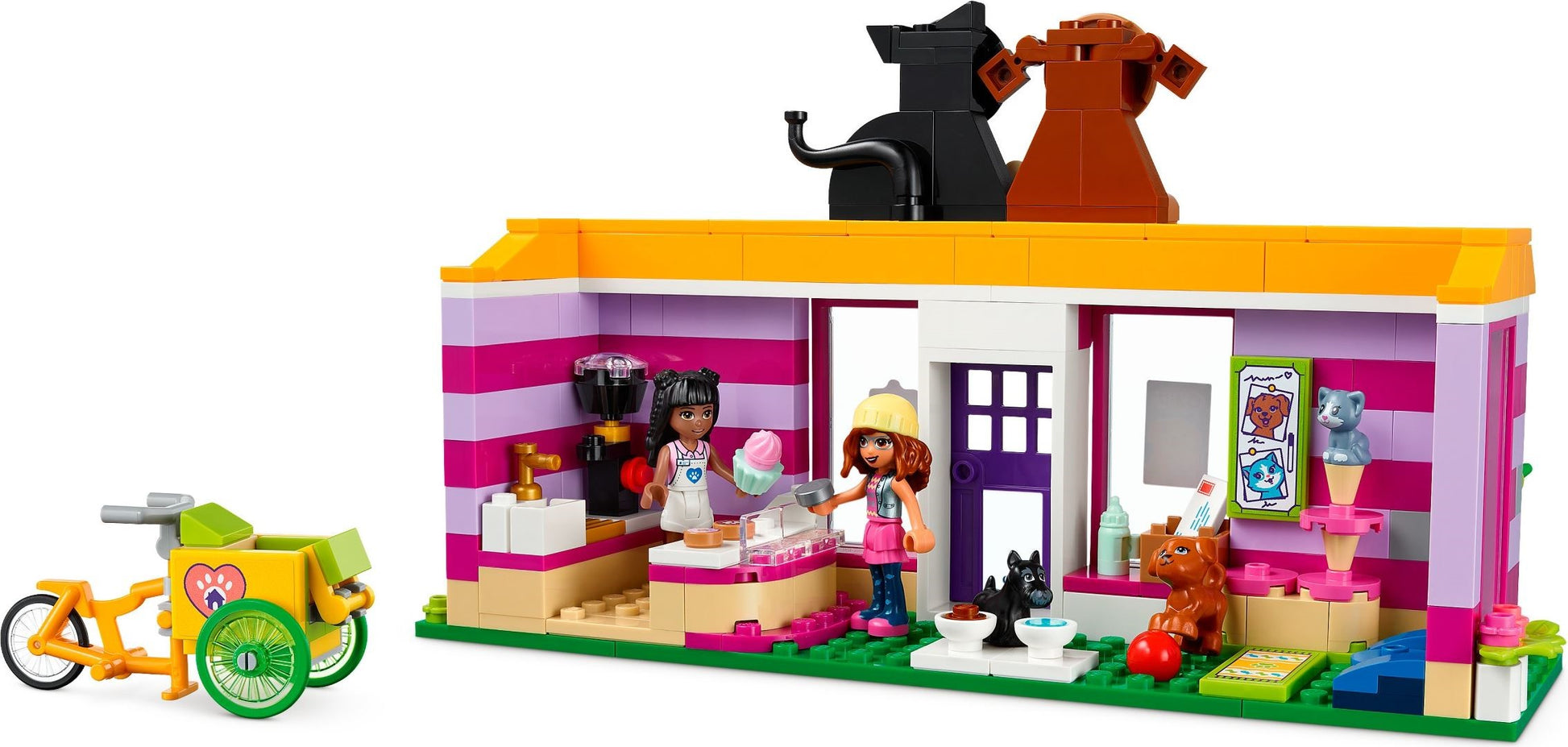 Dette inspirerende settet får fart på barnas fantasi og byr på timevis med gøyal historiefortelling. Settet inneholder en kafé med uteservering hvor LEGO Friends figurer kan bli kjent med dyrene, og et koselig resepsjonsområde. Barn kan sykle rundt i byen med trehjulingen på utkikk etter forlatte kjæledyr, og etterpå kan de trene med dyra. Døren er utstyrt med en liten dyreluke som gjør at dyrene kan komme og gå som de vil!