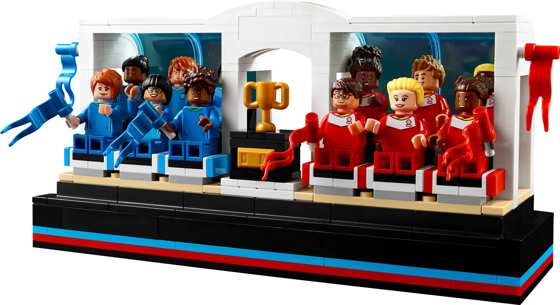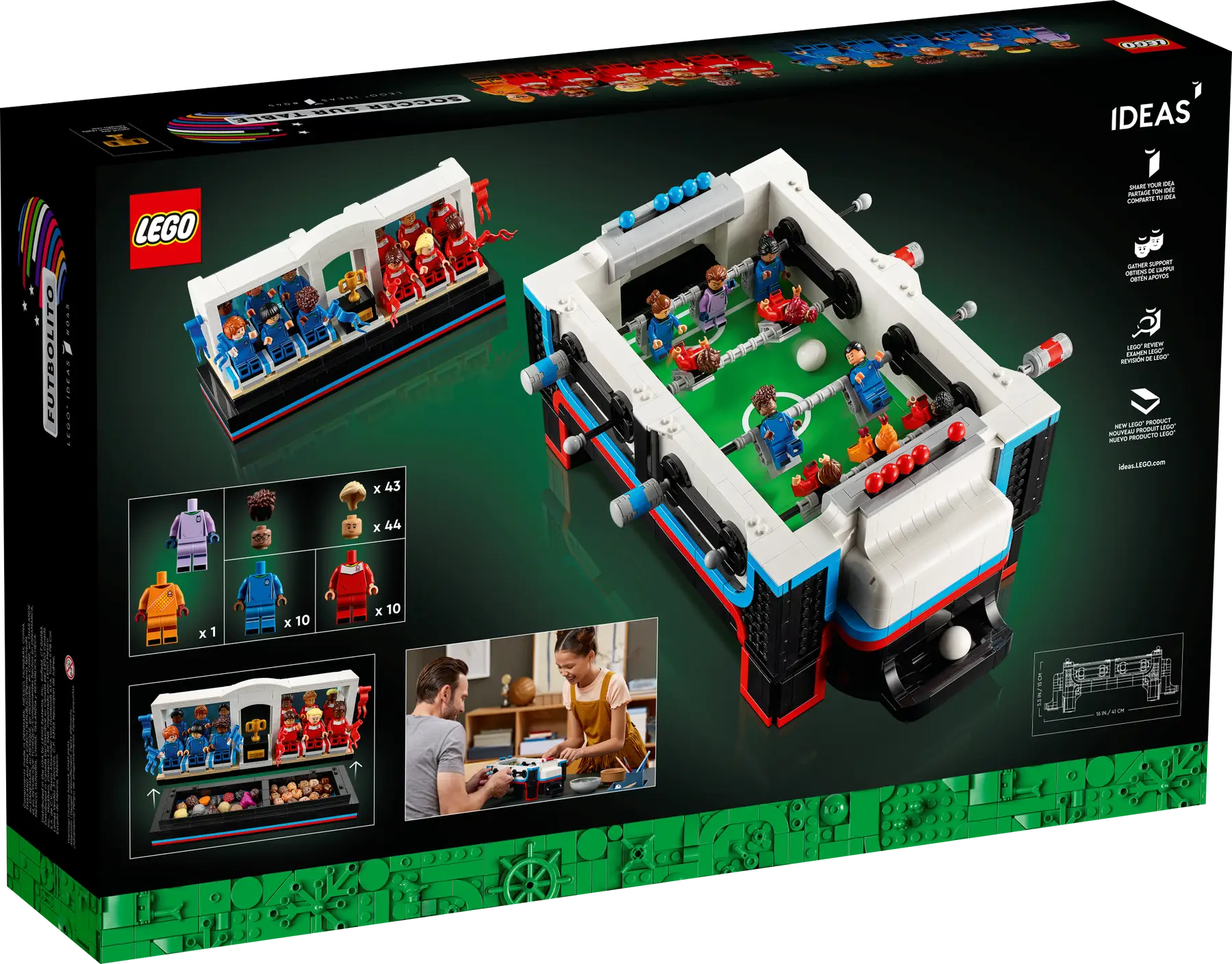 Sett sammen et mesterlag, og la kampen begynne med LEGO® Ideas Bordfotball. Vær fokusert som en toppidrettsutøver mens du bygger denne nedskalerte versjonen av et bordfotballspill i retrostil. Settet inkluderer fargekodede skyvebrytere over hvert mål for måltelling, og 22 LEGO minifigurer (11 til hvert lag), 44 forskjellige hoder og 43 frisyrer, som kan brukes for å gi hver spiller et unikt utseende.