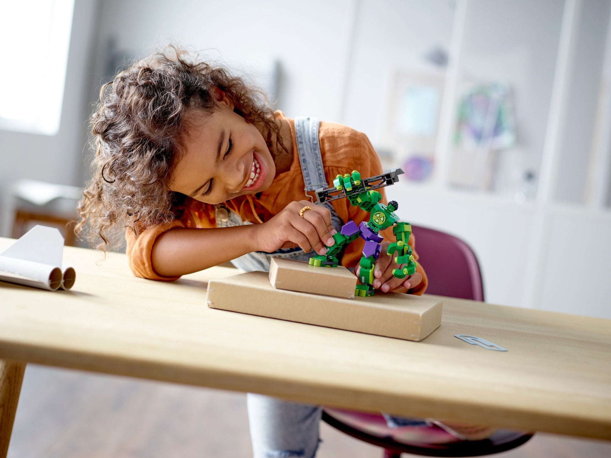 Barn kan plassere LEGO minifiguren av Hulk i robotens cockpit og legge ut på spennende oppdrag med den gigantiske stridsmaskinen. Den leddutstyrte roboten har bevegelige armer, bein og fingre og kan plasseres kule positurer for spennende leke- og utstillingsmuligheter. En søyle av «stein» inspirerer barn til å finne på fantasifull action.