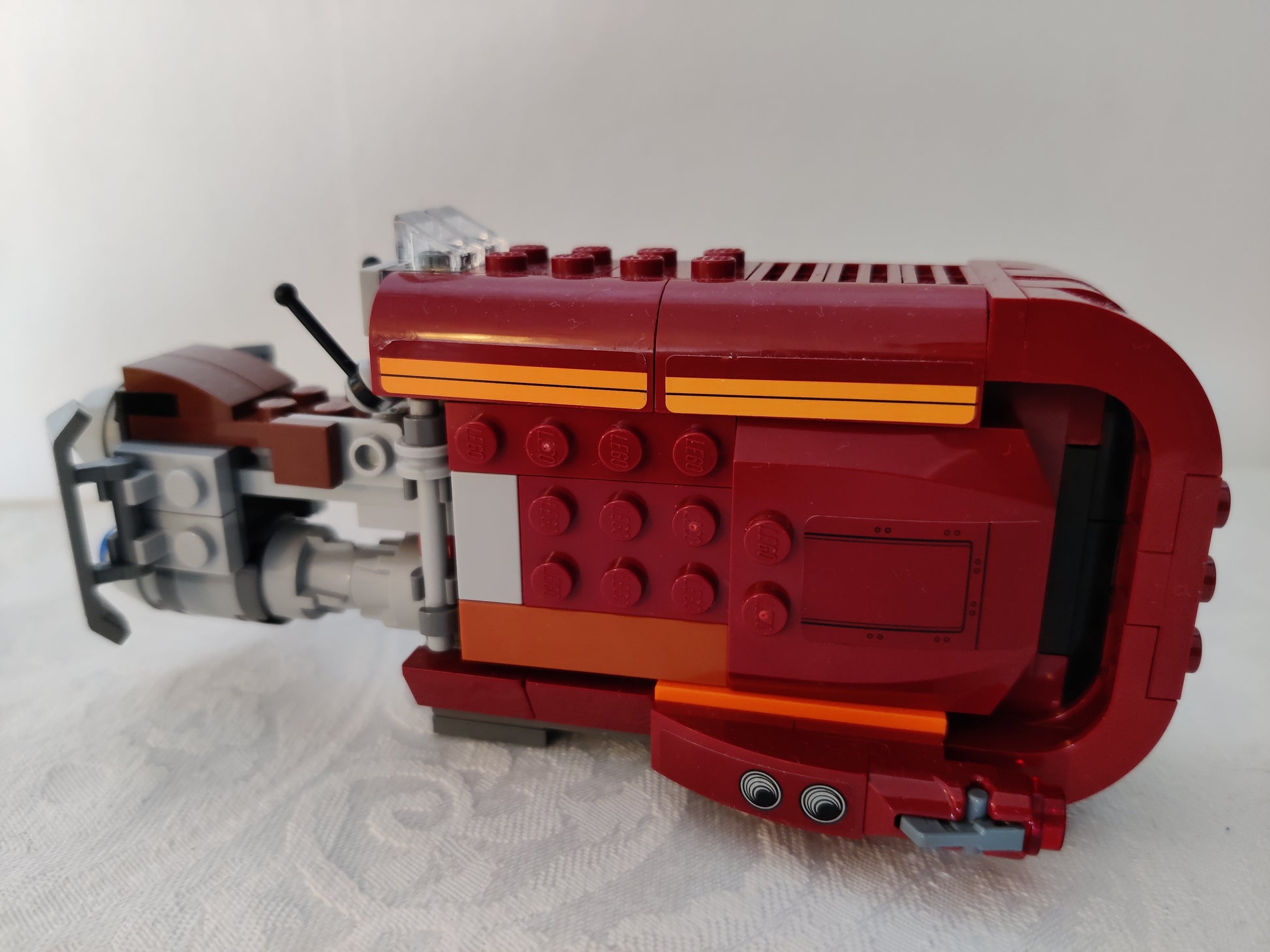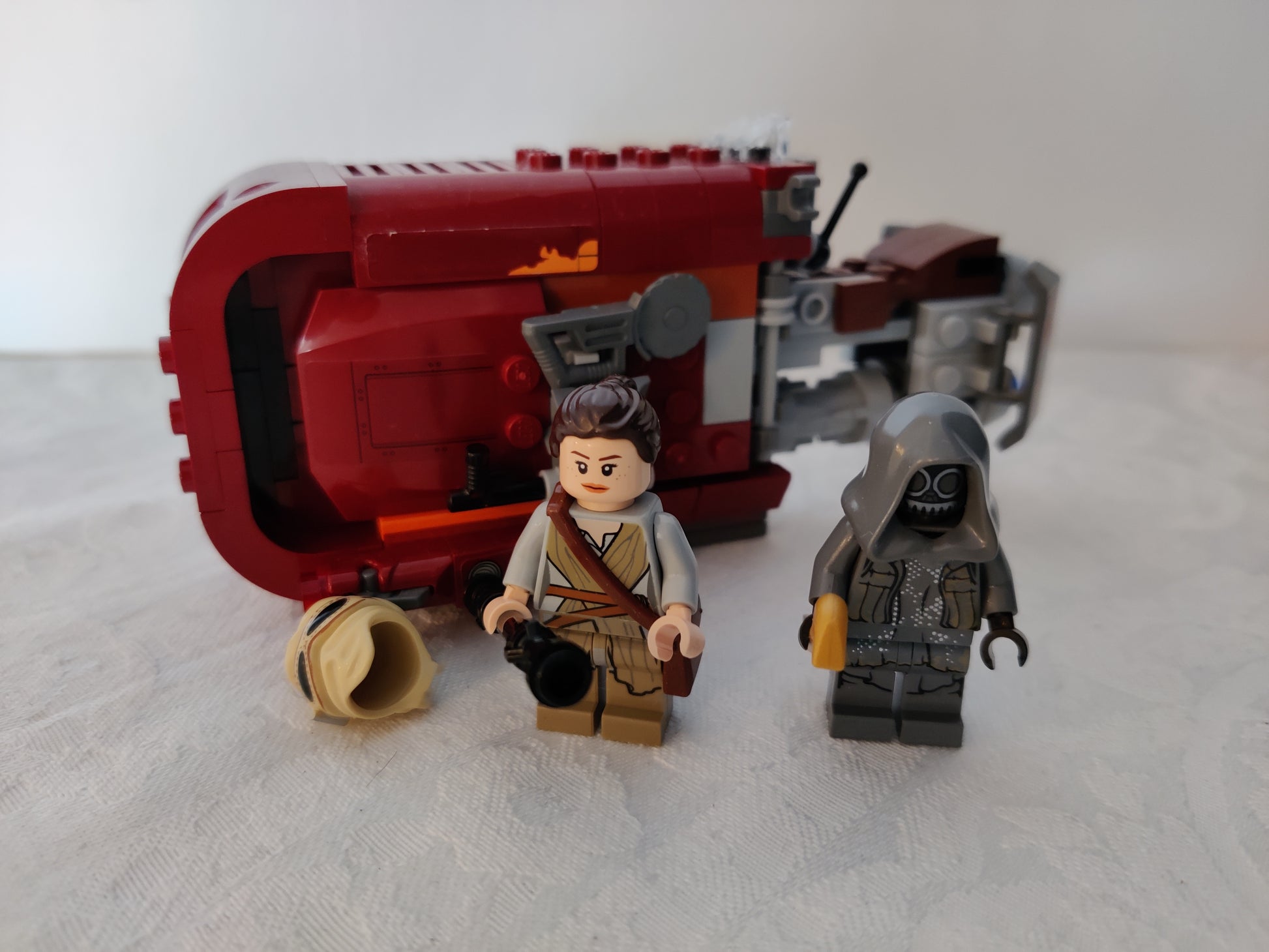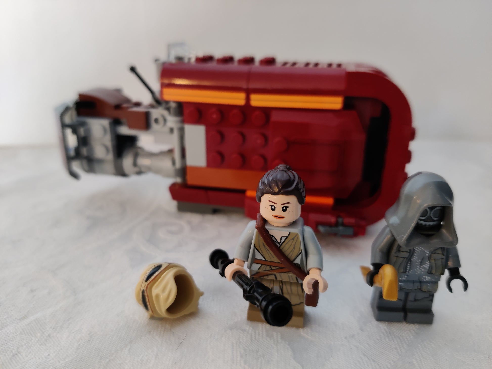 Fly av sted på Reys speeder! Denne tøffe landspeederen har alt Rey trenger til ørkenplanet-rekognosering, inkludert doble knotteskytere, sidemontert bag, blaster, sirkelsag, elektrokikkert og lagerluke som kan åpnes. Modellen har også en avtakbar kjelke med plass til én minifigur. Kjelken kan Rey bruke for å skli i full fart ned sanddynene! Gjenskap fantastiske scener fra Star Wars: The Force Awakens.