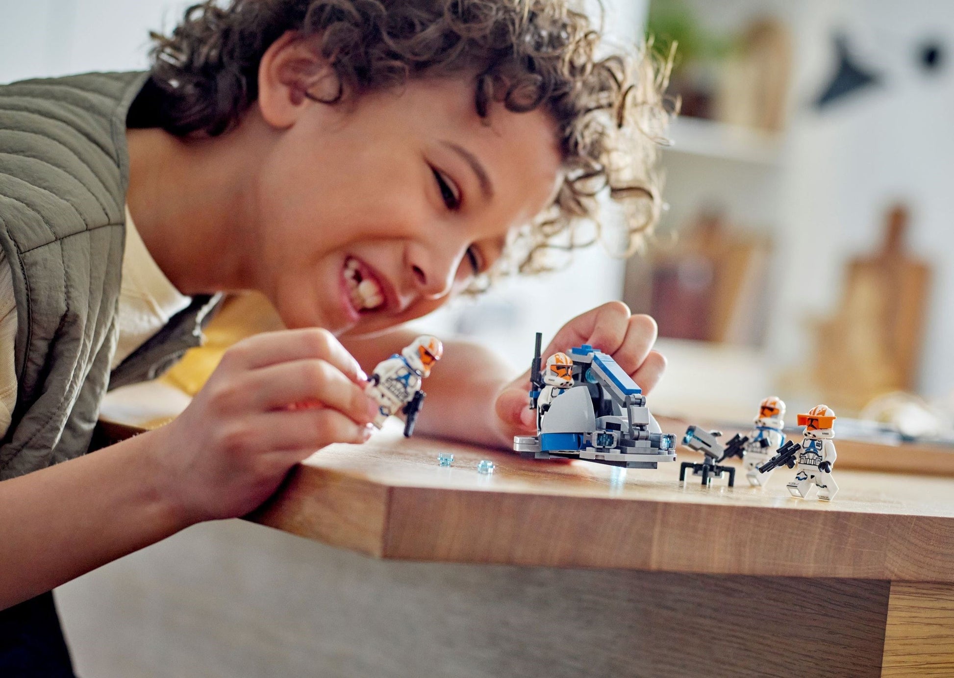 Barn kan gjenskape scener fra Star Wars: The Clone Wars og finne på nye og spennende oppdrag med Stridspakke med Ahsokas klonesoldat fra 332. kompani. Settet inkluderer fire LEGO® Star Wars™ minifigurer – en ny LEGO minifigur av klonekaptein Vaughn med en spesiell hjelm, og tre klonesoldater fra 332. kompani. Settet inkluderer også en blasterrifle, tre blastere og to jetpack-elementer som inspirerer til fantasifull lek. En flott gaveidé for fans av Star Wars: The Clone Wars fra seks år. Det byggbare lekesettet inkluderer også klonetroppens speedersykkel med to knotteskytere og plass til to LEGO minifigurer samt en knotteskytende laserkanon.